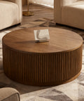 The Allegro Walnut Wooden Round Coffee Table brings warmth, texture, and sophistication to modern and contemporary interiors. Its perfectly round tabletop, crafted from a premium blend of solid and manufactured wood with a rich walnut oak veneer finish, highlights the natural beauty of the grain while offering a durable, smooth surface. The matching walnut pedestal base adds harmony and stability, creating a balanced design that suits both compact city apartments and spacious living rooms alike.