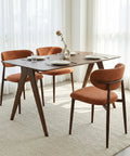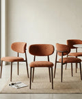 Elevate your dining space with the Almos Set of 4 Velvet Dining Chairs in Burnt Orange, also available in Grey, Green, and White to match your interior style. Crafted with soft velvet upholstery, these chairs feature a distinctive split oval backrest, accented by a curved brown metal support bar that adds a sleek, sculptural touch.